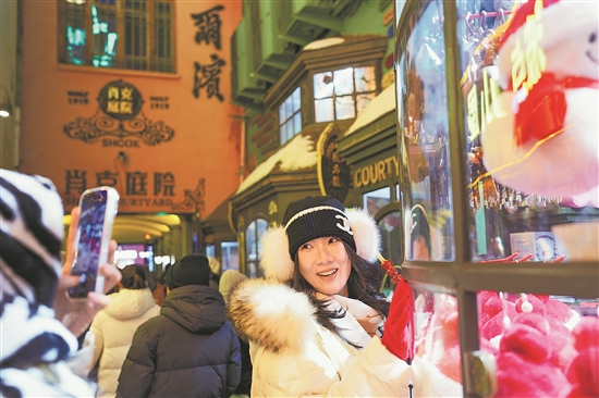 1月11日,游客在哈尔滨中央大街小可花园拍照。目前,“冰城”哈尔滨正迎来冰雪旅游旺季。夜幕降临,已有100年历史的中央大街被灯光照亮。你会感觉仿佛进入了一座流动的冰雪艺术画廊,这将是一次难忘的回忆。新华社 汪建伟 供图